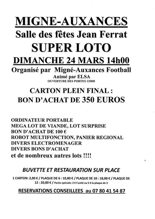 L'USMA Football organise son SUPER LOTO le Dimanche 24 Mars 2019 à 14H à la salle des fêtes Jean Ferrat de Migne-Auxances animé par Elsa .
